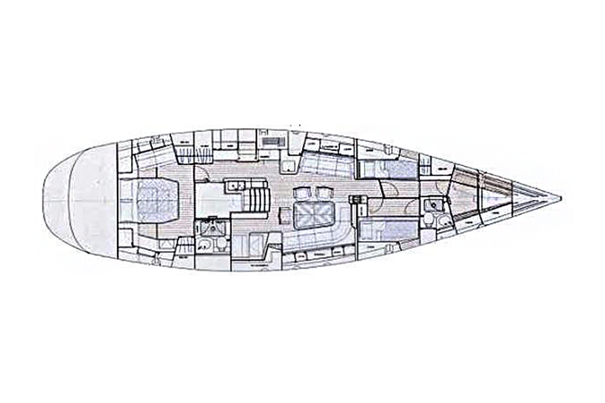 The saloon has a sofa around a dining table that fits up to 6 people. The chart table is also in the saloon with the navigation and electronics equipment.