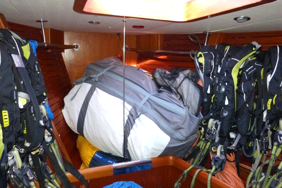 In the forepeak, you will find all the lines and spare sails neatly stored.