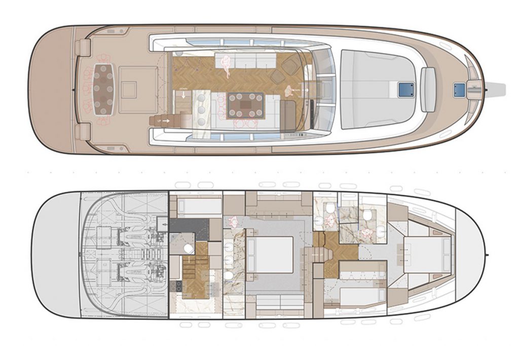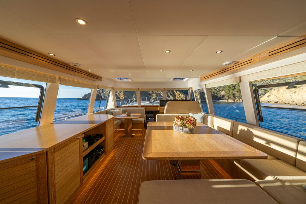 AMARA’s interior features classic white oak wood complemented by ecru white upholstery and walls offer a very well-lit interior that is complemented by the large amount of natural light coming in through the numerous windows on the main deck, as well as providing good ventilation. The main deck plan includes a sizable helm station with seating for two, a small L-shaped dinette adjacent to the helm, and a more expansive U-shaped dinette mid-length. Stairs at the stern provide access to the fully equipped galley. 3 cabins and 3 bathrooms are accessible via bow stairs near the helm, while the crew cabin with an integrated bathroom is accessed from the galley. Noteworthy is the spacious engine cabin, easily accessible for maintenance. AMARA seamlessly blends timeless design elements with cutting-edge technology and luxurious amenities, offering families an unforgettable cruising experience.