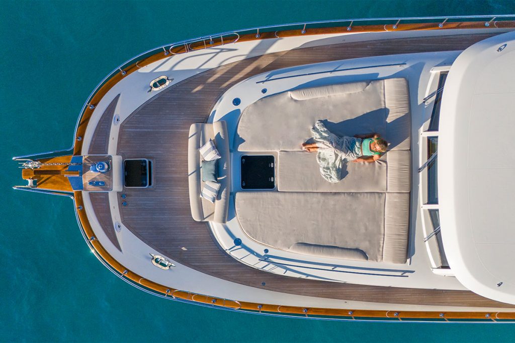 Stretching nearly 20 meters in length, its navigation boasts stability and efficiency. All exterior areas are meticulously crafted to evoke a sense of openness, providing an idyllic setting for embracing life at sea. The large bow sundeck features a sun pad and seating arrangement with comfortable cushions that allows you to appreciate the surroundings while underway or at rest. Two wide walkways with raised handrails connect the bow to the aft cockpit and allow for safe and comfortable circulation. Both the generous flybridge and the Mediterranean-inspired aft deck are designed for enjoying good times in open air. The aft deck of AMARA is a sight to behold, showcasing the timeless wide canoe-stern shaping along with an exceptionally roomy hydraulic swim platform.