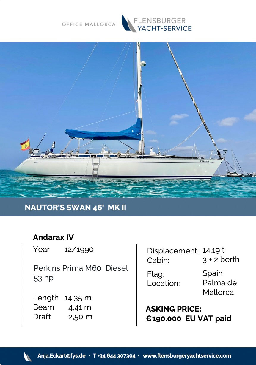 Featuring a robust fiberglass hull, fin keel, and racing rudder, Andarax offers remarkable stability and agility under sail. Power comes from a reliable Perkins Prima M60 diesel engine (58 hp). With a hullspeed of 8.24 knots, this Swan 46 is equally at home on the regatta course or on long, comfortablepassages offshore.