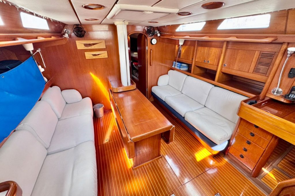 The sleek Frers hull lines ensure excellent hydrodynamics, while the solid construction and moderate displacement (approx. 14.5 tons) provide a secure and confident motion in all sea conditions.